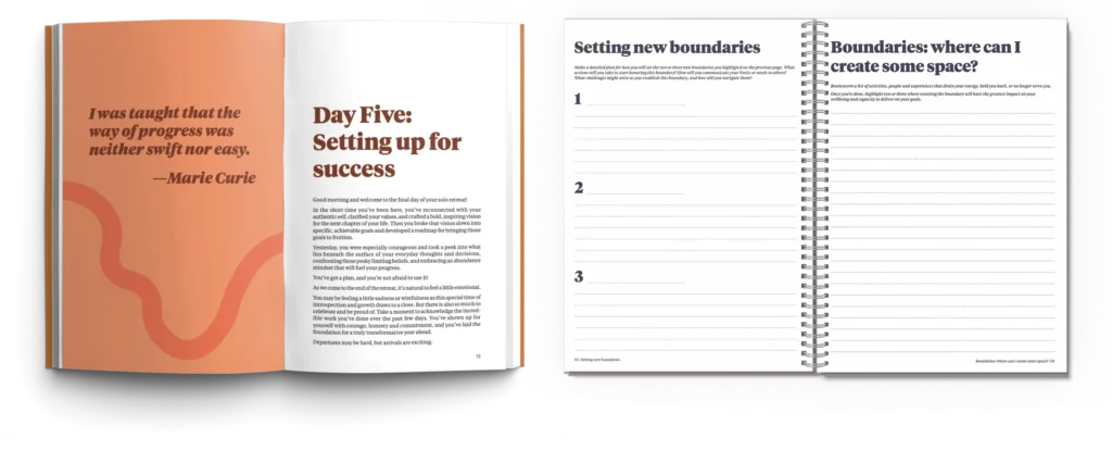 Each day of The Inner Journey program is carefully crafted to guide you deeper into clarity, vision, and renewal. Here’s what your solo retreat looks like, one day at a time. The Guidebook and Workbook also cover: